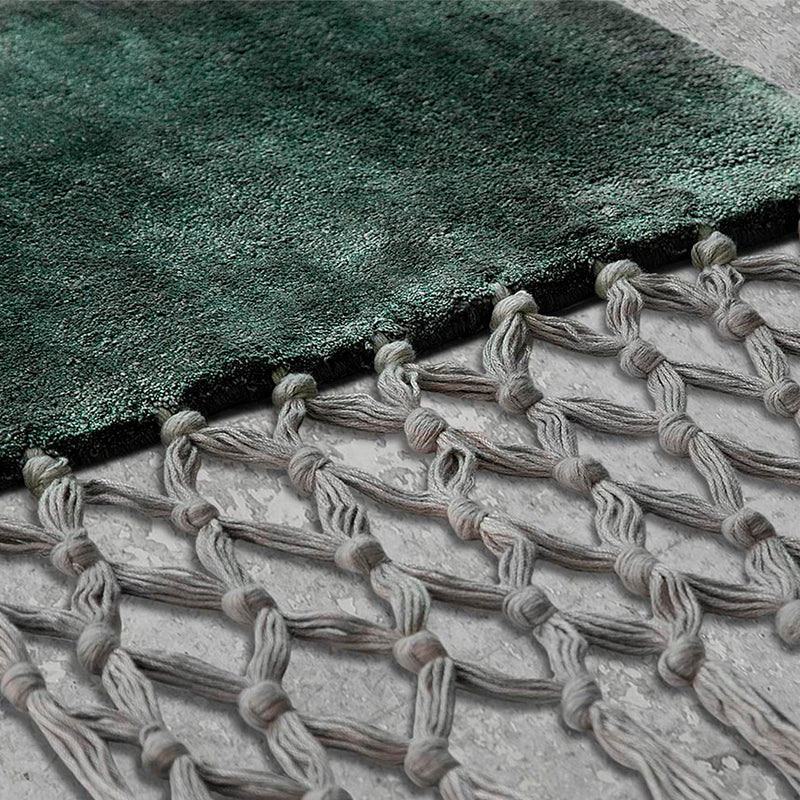 TAPETE HECHO A MANO, HECHO DE SEDAS DE ORIGEN NATURAL CON ENTRELAZADO DE FLECOS LATERALES, COLOR BOSCO SABIA . MEDIDAS: 400 X 300