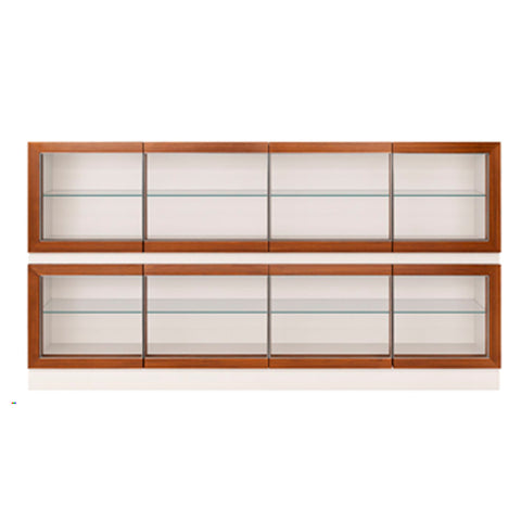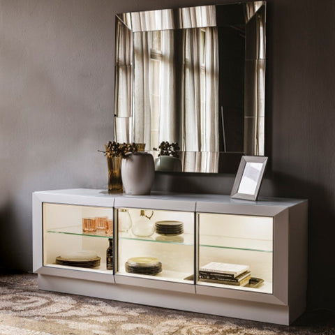 APARADOR CON ESTRUCTURA BARNIZADA BLANCO MATE. PERFILES DE PUERTA BARNIZADOS EN NOGAL CANALETTO. PUERTAS Y ESTANTES INTERNOS EN CRISTAL EXTRACLARO. MEDIDAS: 245 x 49 x 139 H