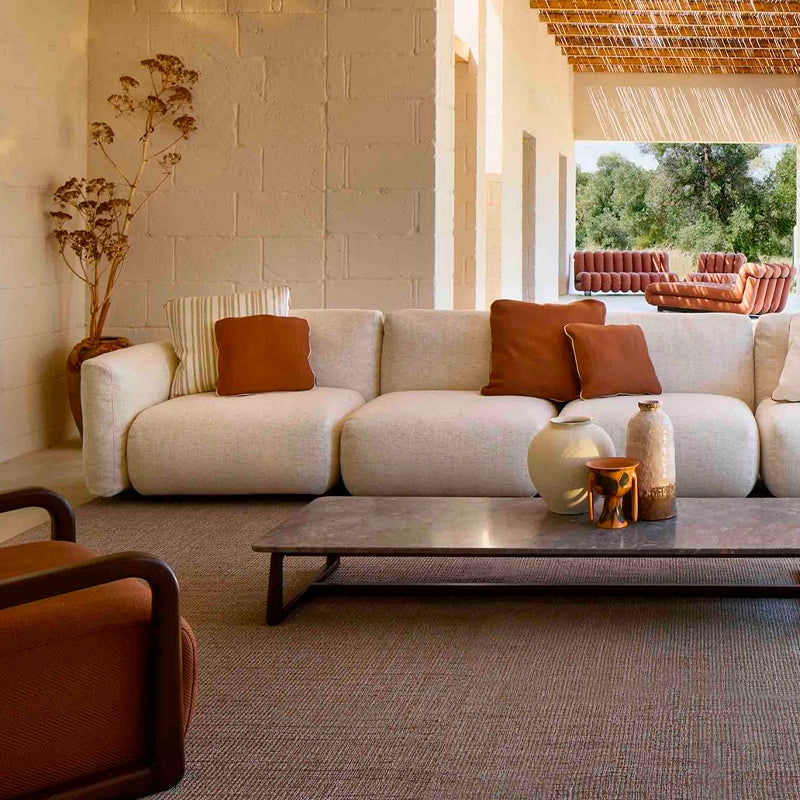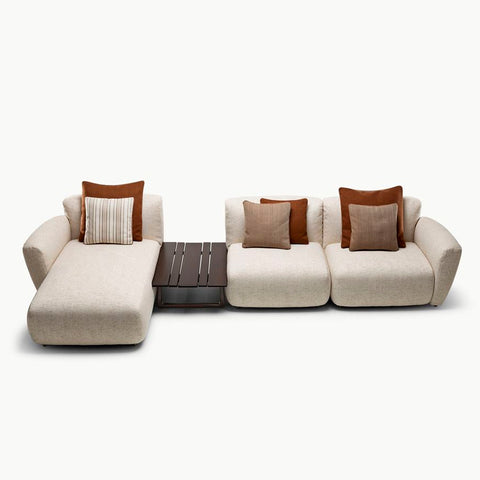 COMPOSICIÓN DE SOFÁ CON ESTRUCTURA EN ACERO INOXIDABLE RECUBIERTO, PATAS EN ALUMINIO CON RECUBRIMIENTO, ASIENTO REVESTIDO EN TELA IGNIFUGA PREMIUM LA PONCHE BIANCORE (INCLUYE: 1 SOFA END ELEMENT RIGHT 110X92X75H, 1 SOFA CHAISE LONGUE LEFT 106X159X75H, 1 SOFA CENTRAL 90X92X75H,1 COFFEE TABLE LPIDC09 90X65X30H, 6 COJINES DECORATIVOS). MEDIDAS: 306 X 159 X 75H