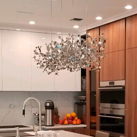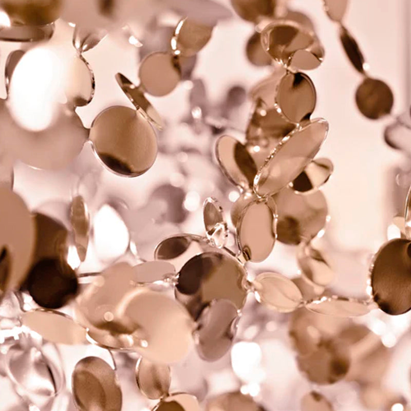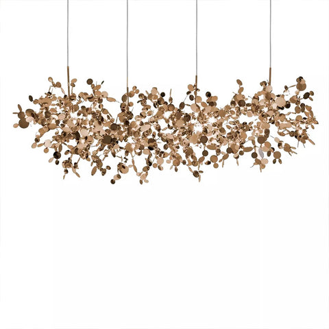 LÁMPARA COLGANTE CON ESTRUCTURA METÁLICA COMPUESTA POR COLGANTES ESTRUCTURADOS MEDIANTE MÚLTIPLES APLICACIONES EN ACERO CHAPADO COLOR CHAMPAGNE. LED. MEDIDAS: 120 X 40 X 190H