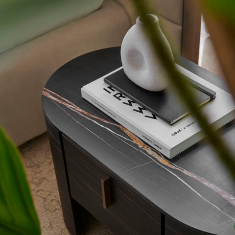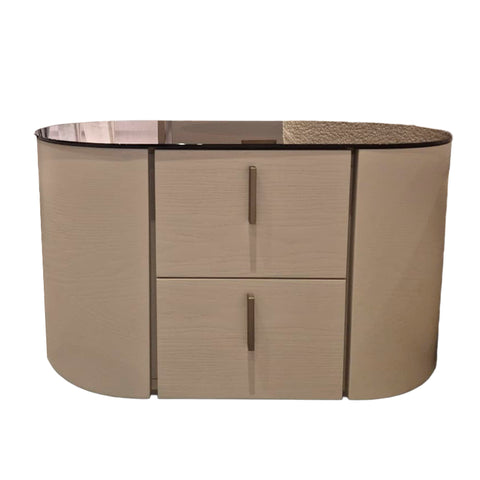BURÓ CON ESTRUCTURA EN MADERA CURVADA EN MADERA IVORY ASH Y TOP EN CRYSTAL ESPEJO BROWN. MEDIDAS: 69 X 39 X 41H