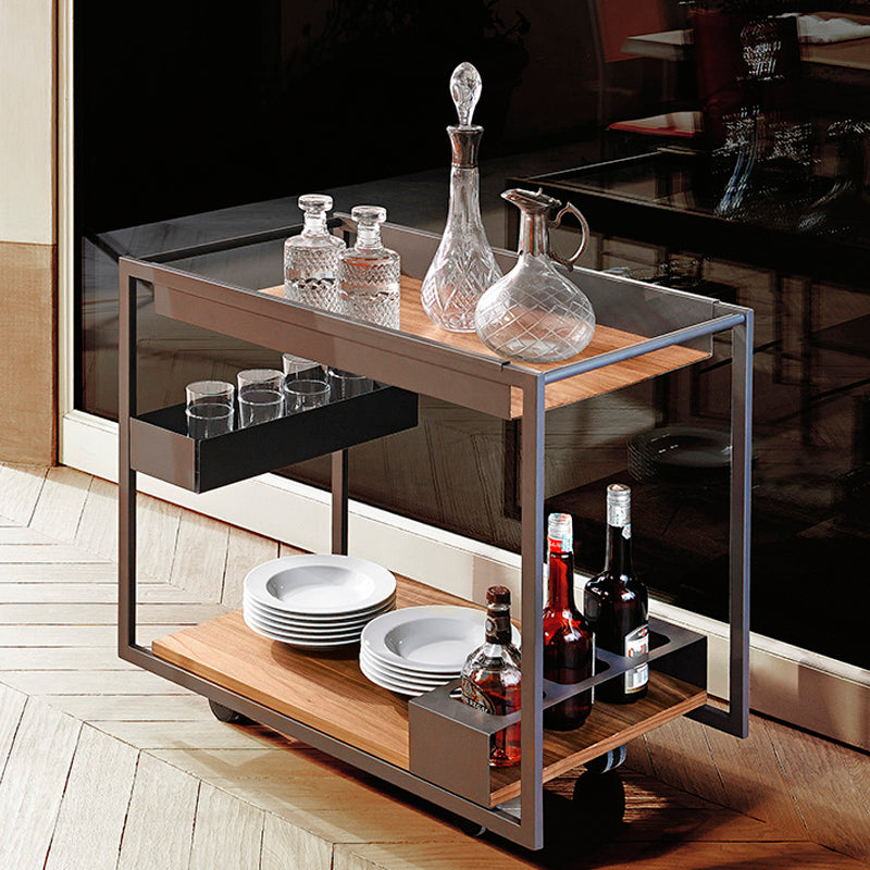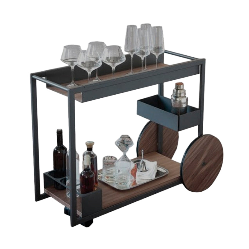 CARRITO BAR, CON BASE EN ACERO BARNIZADO GFM69 GOFRADO GRAPHITE Y TOPS EN NC NOGAL CANALETTO. MEDIDAS 82 X 50 X 80 H