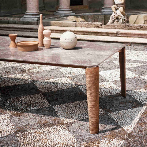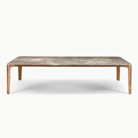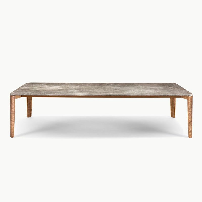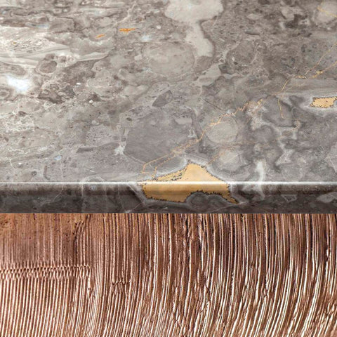 MESA CON ESTRUCTURA EN BRONZE Y TOP EN MÁRMOL SAHARA GREY. MEDIDAS: 300 X 130 X 73H
