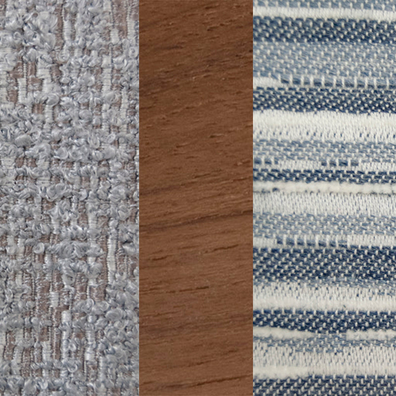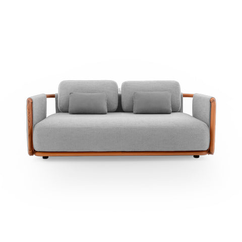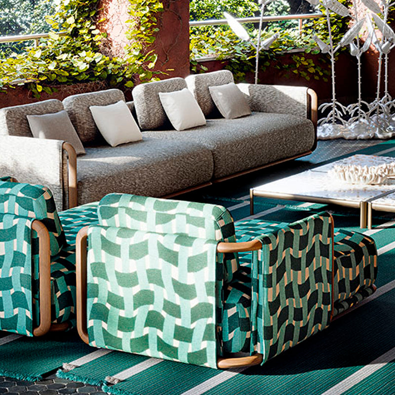 COMPOSICIÓN DE SOFÁ CON ESTRUCTURA DE ACERO INOXIDABLE AISI 316 L PINTADO EN PELTRE, CON INSERTOS DE MADERA MACIZA DE TECA, ACOLCHADO EN POLIURETANO, ASIENTOS REVESTIDOS EN TELA GOBI SMOKE Y COJINES EN TELA CIMA CERULEO. MEDIDAS: 194 X 91 X 82H
