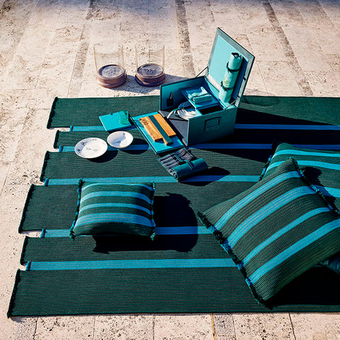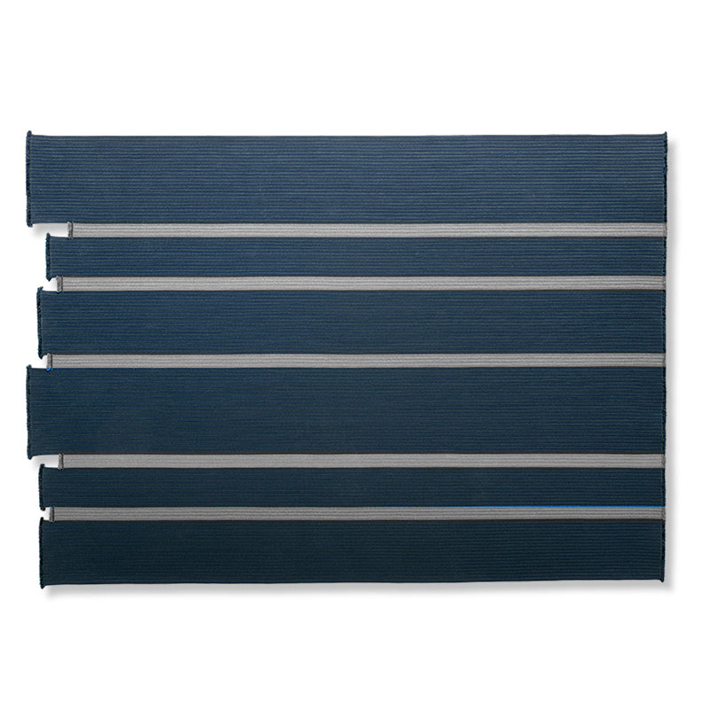 TAPETE REALIZADO DE LA UNION DE TRENZAS DE HILO TECNICO DE POLIPROPILENO COLORES DENIM, NAVY Y ASH. MEDIDAS: 270 x 300cm