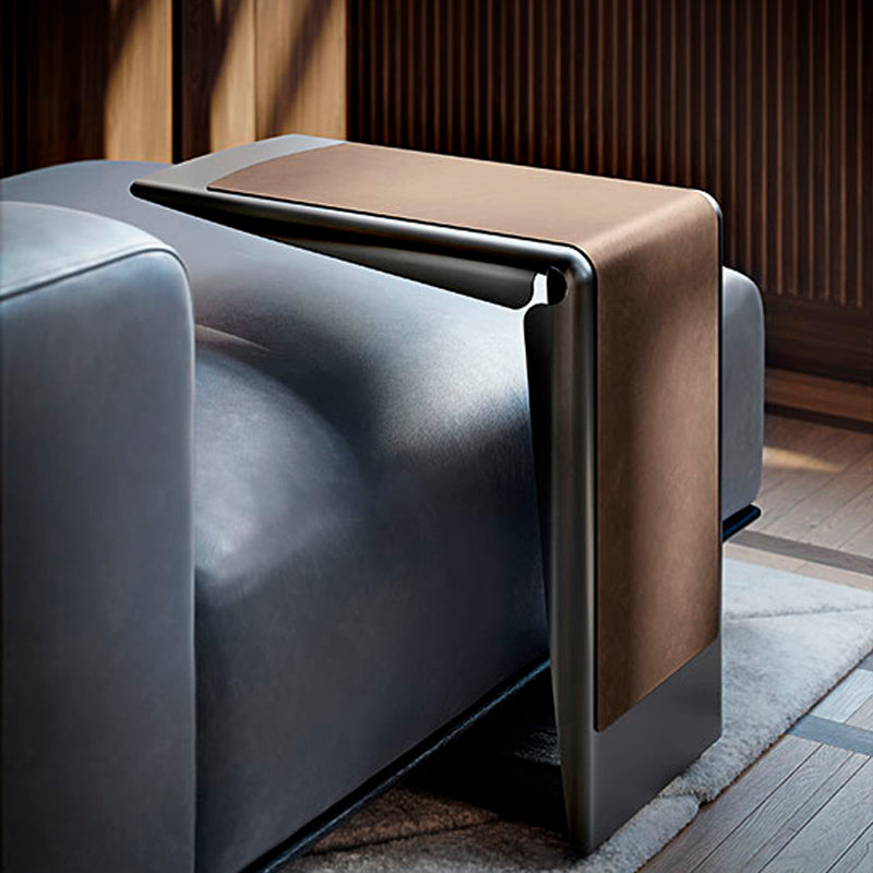 COFFEE TABLE CON ESTRUCTURA EN METAL PINTADO EN PELTRE E INCERSIONES DE MADERA MACIZA 93 FRASSINO GRIGIO ANTRACITE CON BANDA DE PELLE SATIN ANTRACITE. MEDIDAS: CM 100 x 60 x h 35