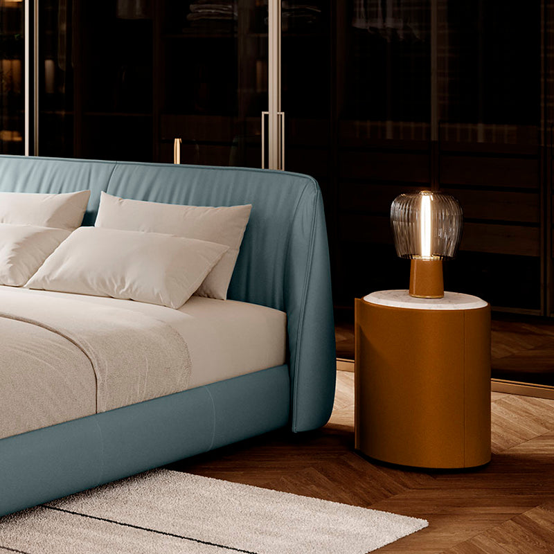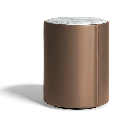 BURÓ CON ESTRUCTURA MADERA CONTRACHAPADA DE HAYA CURVADA REVESTIDA EN PIEL SIENA 56 Y TOP EN MÁRMOL ARABESCATO SEMI BRILLANTE. MEDIDAS: 42 X 42 X 57H