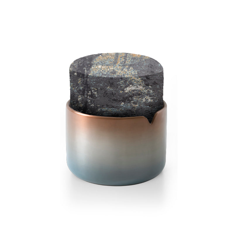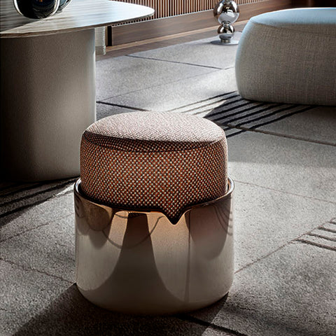 POUF CON BASE EN METAL ACABADO A MANO AVIO COGNAC Y ASIENTO EN TELA TONGA CIELO 02. MEDIDAS: Ø 39 X H 44
